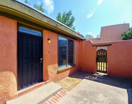 Unique and very private adobe 1 bedroom apartment with large yard in fantastic north valley compound. Charming southwestern touches throughout, with raised ceilings, open dining / living area, and breakfast bar. Brick floors throughout the living and dining areas, while multiple windows, clerestory, skylights, and high ceilings provide fantastic natural light. You'll love the mini-split HVAC too! Includes a large and private backyard, perfect for enjoying NM's outdoor living. Close to shopping, dining, trails and the Nature Center.