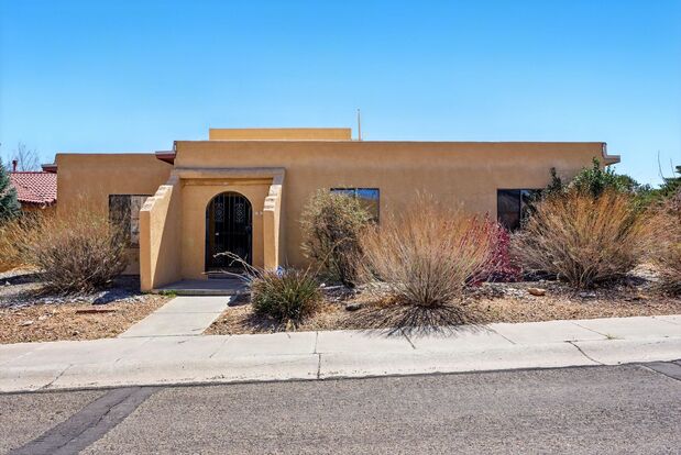 Welcome to this exceptional 3-bedroom, 2-bathroom rental home, located off Ladera and Unser! This home combines style, comfort, and practicality with its inviting open layout and modern finishes. As you enter, you'll be greeted by beautiful tile and vinyl flooring throughout, offering durability and a sleek aesthetic. The spacious sunken living room is a true highlight with a beautiful wooden ceiling that adds warmth and character. The living room also features a unique atrium that brings in natural light and creates a peaceful, serene atmosphere with a beautiful live tree. The kitchen nook is perfect for casual dining, and the wet bar adds a sophisticated touch. Step outside to the covered back porch, a perfect spot for enjoying the outdoors in privacy and security.