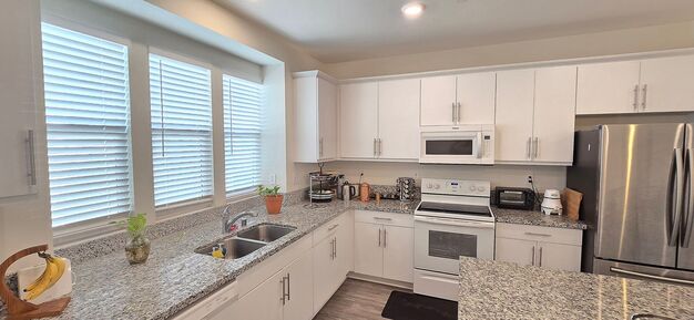 The living room includes a large offset wall for big screen tv and entertainment section. There’s also additional wire access for installing a projector. The living room is spacious and easily accommodates a large sectional and/or corner sofa. The living room and dining room are surrounded by large windows with blinds that allow plenty of natural light. Premium Casa Blanca ceiling fans and recessed lights installed throughout the home. The dining room is centered with a beautiful gold and crystal chandelier.
