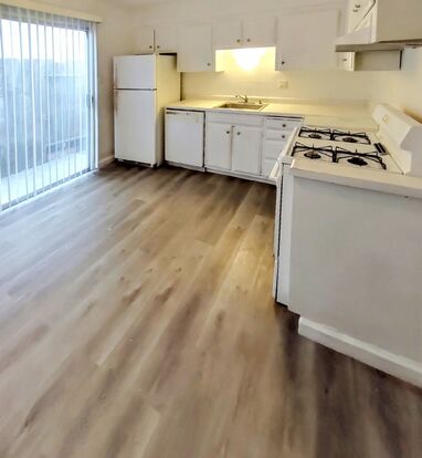 Great upstairs apartment, with 2 bedrooms and 1 full bathroom. There's faux wood flooring and linoleum flooring through out the unit. Kitchen includes a dining area, refrigerator, dishwasher, and gas range. Window A/C unit and gas wall heater in living room. Carport for one vehicle per unit, with storage space.