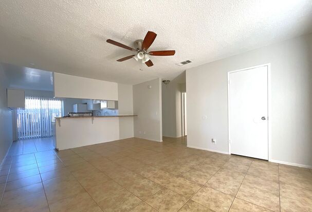 The home features tile flooring throughout, a spacious living room, and a kitchen equipped with granite countertops, a stove, a dishwasher, and a refrigerator. Additional highlights include central A/C and heating, a water heater, ceiling fans, blinds, and a garbage disposal.