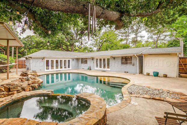Quiet, established neighborhood in central Arlington just a few minutes’ drive to the Entertainment District/sports stadiums and UT Arlington, and a short bike ride to downtown Arlington for restaurants and shopping. This charming 3 bedroom, 2 bath house with 2-car garage is ideal for a small to mid-sized family, perfect for kids to play in this long driveway and huge front yard, shaded with tall, mature trees. Great living and entertainment space including 2 large living areas overlooking the pool/backyard. This beautiful lagoon pool oasis will certainly keep you cool this summer and includes a rock waterfall feature, color-changing LED lights, hot tub and is equipped with both a pool heater and chiller, so you can keep the water at your favorite temperature year-round. The backyard includes a large shed for extra storage, a covered awning great for cooking on your smoker or grill and hosting friends, and is wired with outdoor speakers for music and/or TV. Come see your new home!