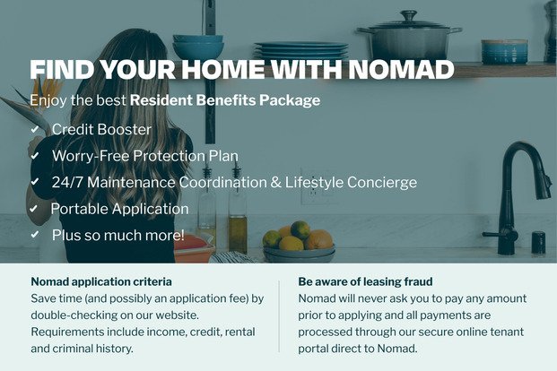 BEWARE OF SCAMS - Nomad will never ask you to pay any amount prior to applying and all payments are processed through our secure online tenant portal direct to Nomad.