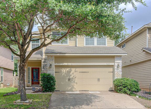 Adorable Sage Meadow 3 bedroom, 2.5 bath home with an upstairs flex space, move-in ready! The kitchen features beautiful oak cabinets, granite countertops, and a tile backsplash. Enjoy sleek wood tile flooring in the living room and tile floors in the kitchen. The oversized primary bedroom boasts an abundance of natural light, a walk-in closet, and features a bathroom with double vanities and a soaking tub. Upstairs, there is a flex space ideal for a workspace or second living room. The fenced backyard with a covered porch offers privacy with no neighboring houses behind the property! Fabulous location, convenient to Slaughter Ln, Menchaca Rd, South 1st, and I-35. Close to many employers, retailers, and zoned to Akins HS