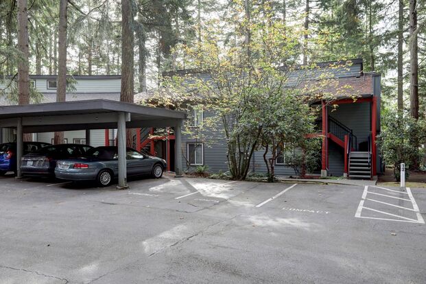 Great location for this comfortable condo in quiet, well maintained Eastbridge condo community. Spacious living room with wood burning fireplace. Great deck overlooking greenbelt, extra storage on deck. Updated kitchen with lots of counter space, new cabinets, counters, flooring and oven. New cabinets and countertops in the bathroom. Condo has a large laundry room with extra storage with Washer and dryer included. New carpeting in bedrooms. Water, sewer and garbage plus 1 covered parking space included. Minutes from Microsoft, downtown Bellevue, easy access to freeway. Sorry, no pets.