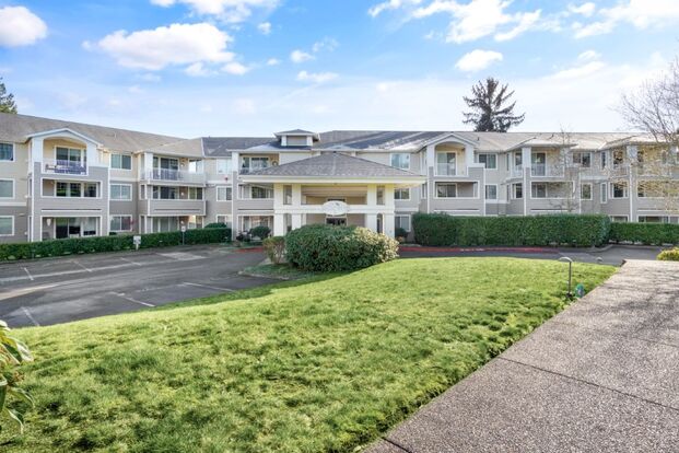 Available Now! Spacious, light and bright condo available for lease in Bellevue with open and inviting floorplan at Le Chateau. Kitchen with stainless appliances and tile counters overlooks living room with cozy gas fireplace. Bonus space is perfect for a home office or extra storage. Slider off living room leads to deck with greenbelt views. One bedroom with walk-in closet and oversized bathroom. Laundry in unit. Fresh paint and new carpet throughout. 2 parking spaces included. Community pool – perfect for hot summer days. $400 move in fee. Small pets under 25 lbs ok.