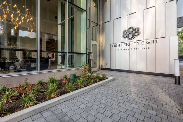 888 is 158 luxury residences on 18 floors with stunning territorial views of downtown Bellevue and beyond. Enjoy attention-to-detail designer finishes like custom closets and under-mount cabinet lighting in every home. Hotel-like amenities include a 19th floor rooftop deck, yoga studio, business center and dog run to name just a few. With an angled design and boutique stacking plan, floor plans have been maximized for spacious city living at its finest.