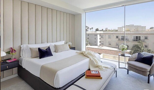 A harmonious blend of privacy and indulgence, Mandarin Oriental Residences, Beverly Hills offers the intimacy of a private home enhanced by the legendary service of a five-star hotel. Designed in collaboration with the internationally acclaimed 1508 London, each residence is a masterclass in refinement where daily rituals are elevated into moments of quiet luxury. The rooftop is a sanctuary unto itself, with sweeping views of Beverly Hills' iconic palm-lined streets. Surrounded by citrus trees and fragrant plantings of lavender, rosemary, and sage, the rooftop oasis features a heated pool, towel service, and serene lounge areas infused with calming natural scents. Wellness offerings continue with an impeccable spa suite featuring private treatment rooms, a steam room and sauna, and a state-of-the-art fitness center with Technogym equipment, private training room, and a sunlit outdoor terrace overlooking Century City. On the ground level, residents enjoy access to a private boardroom and a cozy fireplace lounge perfect for entertaining or working from home in style. Around-the-clock valet, concierge, and in-residence services ensure every detail is handled with signature Mandarin Oriental grace and discretion. residence 304E is a sun-drenched one-bedroom retreat with a south-facing orientation overlooking tree-lined Palm Drive. The open-concept Great Room flows effortlessly into a spacious kitchen anchored by a leathered Taj Mahal quartzite island. Elegant, durable, and ideal for both casual dining and entertaining. A private terrace extends the living space outdoors, while the tranquil primary suite includes a five-fixture bath and an adjacent walk-in closet, offering comfort, luxury, and functionality in equal measure.