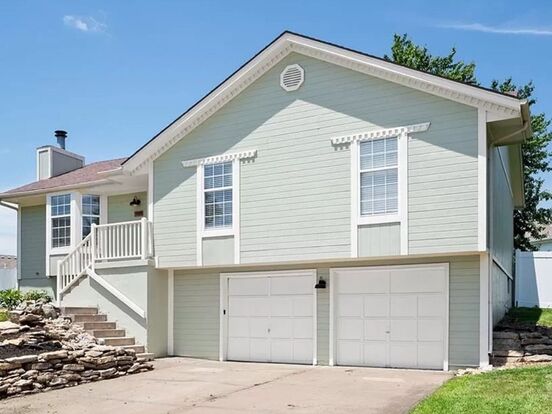 This is a 3 bedroom, 2 bathroom, 1700 square foot home in Blue Springs, Missouri. The property has 2 garage doors and a deep driveway big enough for 4 additional cars.