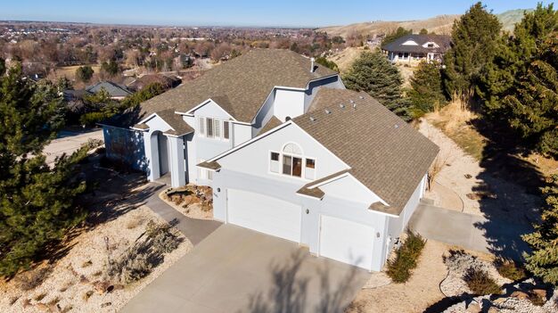 Perched on a scenic hill, this beautifully crafted home offers panoramic views of Treasure Valley, from Boise to Eagle, with stunning sunrises, sunsets, and holiday fireworks. Thoughtful amenities include double-paned windows, custom basswood shutters, solid oak hardwood floors, cathedral ceilings, and exquisite craftsmanship. The spacious kitchen boasts alder floors, granite countertops, and a walk-in pantry. Towering windows enhance the inviting living space. The primary room includes a large walk-in closet, jacuzzi tub, and dual shower heads. Additional highlights include a private study, bonus room, and a thoughtfully designed backyard with a koi pond. Recent upgrades offer new owners a turn-key ready property with premium water filtration system, new roof, fresh paint inside and out, and carefully planned xeriscaping with native, mature, water wise, fire wise plant life