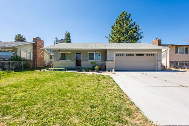 Enjoy a spacious living area filled with natural light, a functional kitchen with ample cabinet space, a dedicated dining, a large backyard—perfect for outdoor entertaining, and a cozy living room with a working fireplace. The home features a primary suite with a large closet, two additional bedrooms, and a full bathroom with a tub/shower combo. There is a two-car garage with ample storage as well as an extra pantry/food storage, lots of storage closets around the home and mature landscaping with a garden that is currently harvesting tomatoes and peppers with more to come later this season.