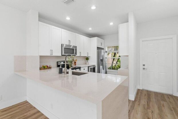 Now available for rent in the sought-after Boynton Oasis community! This beautifully renovated home combines modern design, comfort, and convenience in one inviting package. The chef's kitchen is a true highlight, featuring white shaker cabinetry, luxurious quartz countertops, top-of-the-line stainless steel appliances, a built-in wine cooler, and an expansive island perfect for cooking, dining, and entertaining. The 2.5 bathrooms have been tastefully updated with matching white cabinetry, sleek backlit mirrors, and contemporary fixtures, creating a clean, refined look. Enjoy your morning coffee or unwind in the evening on the screened-in patio, offering a peaceful outdoor retreat
