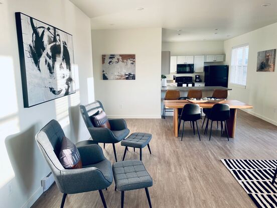 Sagebrush | Furnished & Spacious | Electricity & Internet included - This newly constructed West-facing apartment is situated on the top floor of a two-level building. It features an open floor plan with luxury vinyl flooring throughout, contemporary furniture, natural light, spacious kitchen and living area. Overlooking fields, it offers exceptional views of the Tobacco Root mountains and a private outdoor balcony to enjoy the spectacular sunsets of Montana.