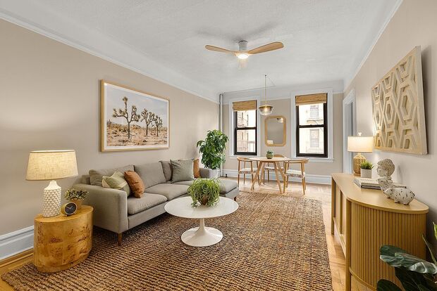 A gracious foyer, currently being used as a home office, welcomes you into the airy, two-windowed living room with original hardwood floors. The adjacent windowed kitchen features rich wood cabinetry, butcher block counters, tiled backsplash, and stainless-steel appliances including a dishwasher. Just off the kitchen, two grand bedrooms await. The expansive primary bedroom is a true retreat with three oversized windows, custom built-in bookshelves, new ceiling fan, and an extra-large closet. The palatial second bedroom offers versatility as a guest room, nursery, or home office.