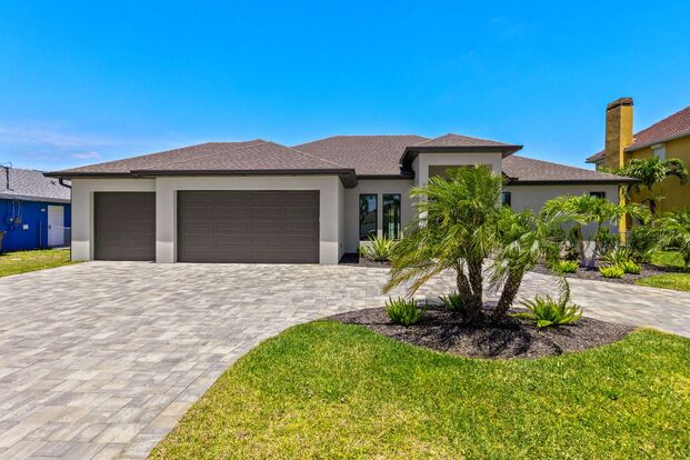 BRAND NEW- Experience luxury living in this newly constructed pool home located in the heart of SW Cape Coral. Boasting 3 bedrooms plus an office space, 2 full bathrooms, and a spacious 3-car garage, this home offers unparalleled comfort and convenience. With soaring ceilings, impact windows, and tile flooring throughout, the open-concept kitchen is a culinary delight featuring stylish white shaker cabinetry, marbled Quartz counters, and a new stainless steel appliance package. Retreat to the master suite with tray ceiling, transom window, and sliding glass doors overlooking the pool and private backyard oasis. The large pool deck with screened-in lanai, extended patio space, outdoor shower, and pool bath is perfect for entertaining or relaxing in the Florida sun. Enjoy resort-style living near Cape Habour Marina, parks, boat ramps, and beaches. Don't miss out on the opportunity to make this your dream home
