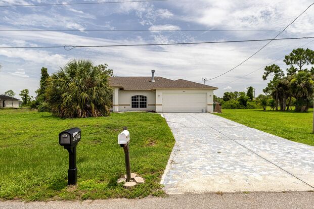 Showing by appointment only Introducing a unique 3/2 + Den home in a great location in Cape Coral, FL. This charming house features an office space, spacious rooms, and an inside laundry room with a washer and dryer for added convenience. The eat-in kitchen is perfect for enjoying meals with loved ones, while the decorative fireplace adds a cozy touch to the living space. The unique floor plan includes a Jack and Jill bathroom, as well as a patio area in the backyard with a fire pit and benches for outdoor gatherings. The primary bathroom boasts a soaking tub and walk-in shower for a relaxing retreat. Located just minutes from US 41 off Del Prado N, this home offers both comfort and convenience in a desirable neighborhood.