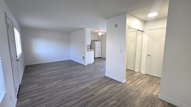This upstairs unit has a full kitchen with refrigerator, stove, and plenty of cabinet space. Bathroom with tub/shower combo, 2 closets with mirrored wardrobe doors, and a large balcony with storage closet. Community laundry on site and off street parking. Water and trash included.
