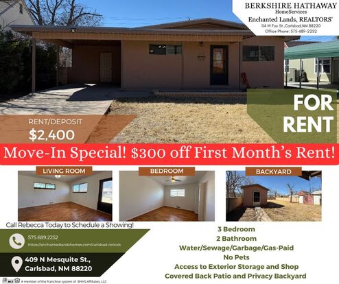 Call Rebecca at 575-689-2252 to schedule a showing, applications available at EnchantedLandsHomes.com/Carlsbad-Rentals