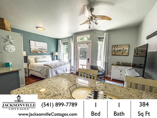 Introducing Parkside Suite: This modern studio is located in the heart of downtown Jacksonville, Oregon. It is fully furnished studio offers a contemporary living space with all utilities included. The Parkside Suite features a cozy queen-sized bed, perfect for a comfortable night's sleep. The modern bathroom provides convenience and functionality. The kitchenette is equipped with a two-burner hotplate, microwave, refrigerator, and coffee pot, allowing you to prepare your favorite meals. Stay connected with complimentary Wi-Fi and enjoy your favorite shows on the flat-screen TV. With a washer/dryer in the unit, laundry becomes a breeze. The Parkside Suite is conveniently situated near two dog parks, making it an ideal choice for pet owners. Explore the vibrant downtown area, with shopping and dining options just a stone's throw away. Nature enthusiasts will appreciate the proximity to hiking trails, offering endless opportunities for outdoor adventures. Don't miss out on this fantastic opportunity to live in a modern studio condo in downtown Jacksonville. Experience the convenience and comfort of the Parkside Suite today!