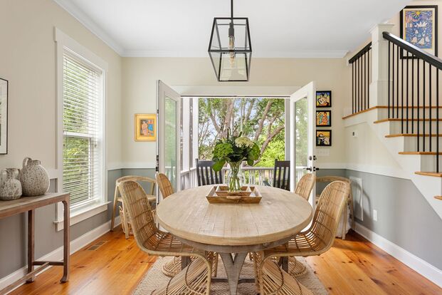 The open plan living and dining area leads directly out back to a private, screened in porch overlooking the marsh. Enjoy your morning coffee or sunset cocktail from the screened porch or entertain guests fire side in the backyard around the patio's fire pit. The expansive back yard also boasts a custom boardwalk deck and ample privacy created by the natural landscape of the marsh and a lush bamboo privacy wall. There is also a mosquito deterrent spray system so you can enjoy the evenings outdoors without pests!