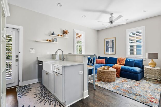 Step inside to a open living area with high ceilings, plentiful windows with shutters, and a cozy sectional sofa for relaxing after a day exploring the city. The kitchen features stainless steel appliances, bar seating for three, and everything you need for cooking at home. A washer and dryer are conveniently tucked away in the pantry closet.