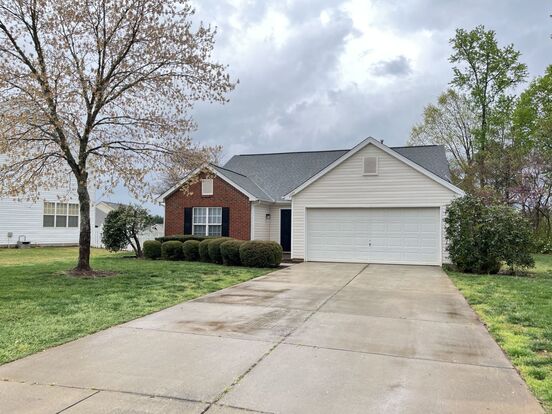 This spacious ranch home features 3 bedrooms, 2 full bathrooms and over 1300 square feet. It has an open concept living, dining and kitchen area with vaulted ceiling, fireplace and lots of cabinets. The large master bedroom also has vaulted ceiling, walk in closet with custom built-in and a private full bath with garden tub. The home also has a 2 car garage, rear patio and large back yard with a great view. Located on a quiet cul-de-sac lot across from the pool in the Hamilton Green community. Just off of Hamilton Rd. near Hwy 160. Close to Carowinds Blvd and South Carolina. Minutes from I-485 and Uptown Charlotte. Rent this home with first months rent and a $1950 deposit.