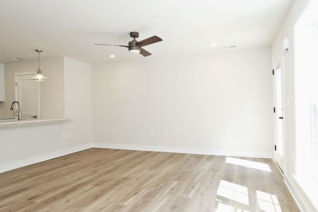 This 880 sqft ground-level apartment features luxury vinyl plank flooring throughout, an open living and dining area, and a galley-style kitchen with quartz countertops and stainless steel appliances. The spacious bedroom includes a walk-in closet, and the full bathroom offers tile flooring. A stacked front-load washer and dryer are included for convenience, and one parking space is available in a nearby lot.