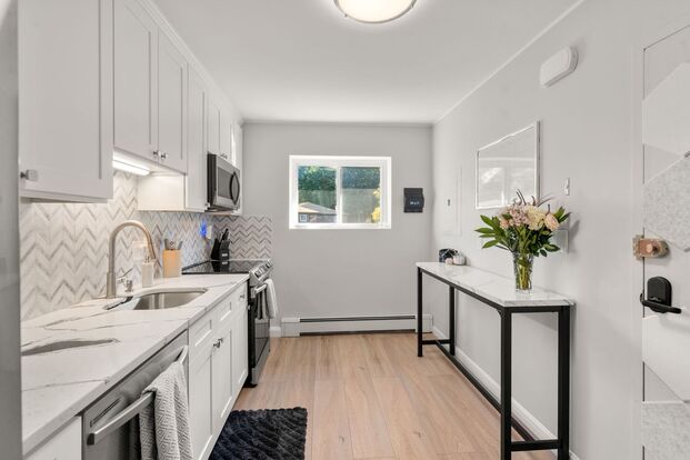 Located on the Brookline/West Roxbury line, this beautifully renovated top floor condo with a private balcony is in the charming Chestnut Village community. This condo has a stunning kitchen with stainless steel appliances, quartz countertops, white shaker cabinets, and a stone backsplash. Throughout the condo you have luxury wide plank vinyl floors, recessed lighting, great closet space, updated windows, and a built-in wall AC. Enjoy the chic bathroom with marble floors and designer grade tile. This complex is a close drive to multiple shopping centers, grocery stores, restaurants, and other conveniences. Chestnut Village offers amenities like an inground swimming pool, tennis courts, playground area, and in-building laundry. One parking spot is included and ample visitor parking spaces are available.
