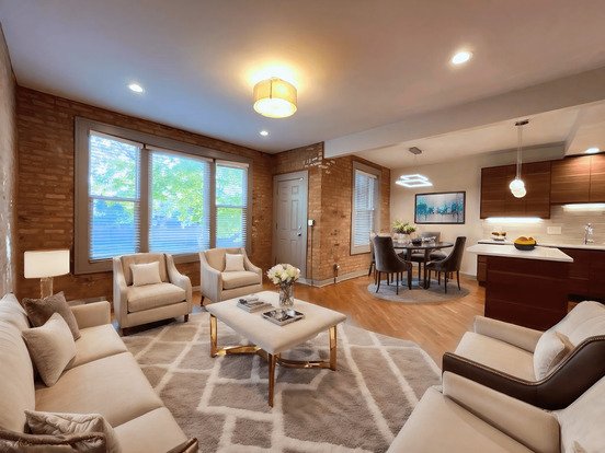 Every detail counts including the Bromi Design chrome with white glazed steel mesh semi flush lights, Vonn Atria Duo LED dining chandelier, chrome Callen Mini-Pendants, Decora switches & dimmers, strategically placed cable & electric for flat screen TVs, 2” horizontal white blinds & SS closet organizers in 4 closets! Across the street is the 2.2 acre Hadiya Pendelton Park! Shop at the nearby Mariano’s or Whole Foods. One block from the Green Line Train, close to buses, LSD & 90/94 & I-55.