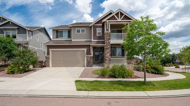 This Classic Somerset model welcomes you with with mountain views at the edge of a cul de sac in the desirable Banning Lewis Ranch neighborhood. You will have plenty of space in this home with 5 bedrooms, 4 bathrooms, and 3 car tandem garage. This home has an open floor plan with an office on the main level, large kitchen with plenty of cabinet space, stainless steel appliances, and a large island that opens up to the main level living room with gas fireplace. Upstairs you will find a large loft, 3 bedrooms, and laundry room. The large primary bedroom has an attached private balcony with stunning mountain views and a private 4 piece bathroom with extended shower.