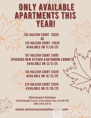 Please contact Simonson Estates at 260-244-2816 to learn more. This property is managed by a responsible landlord using Avail landlord software.