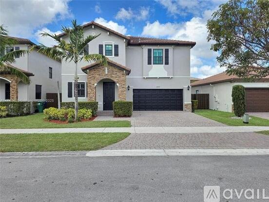 Beautiful 2-story home in the desirable Silver Palms community. located across from a park with a children's play area and recreational field. This 5 bedroom, 3 bath home boasts a spacious layout with formal living, dining, and family room, open-concept into the kitchen featuring a breakfast bar and nook, The first floor has a guest suite and bathroom, while the second floor offers an oversized master suite with a sitting area, large walk-in closet, soaking tub, and enclosed glass shower. Porcelain tile floors, laminated wood, carpeting in 2 select bedrooms, Impact windows, stylish plantation shutters, Smart Home technology, 2 car garage, and a large fenced backyard for outdoor gatherings. Impact windows and community resort-style amenities.
