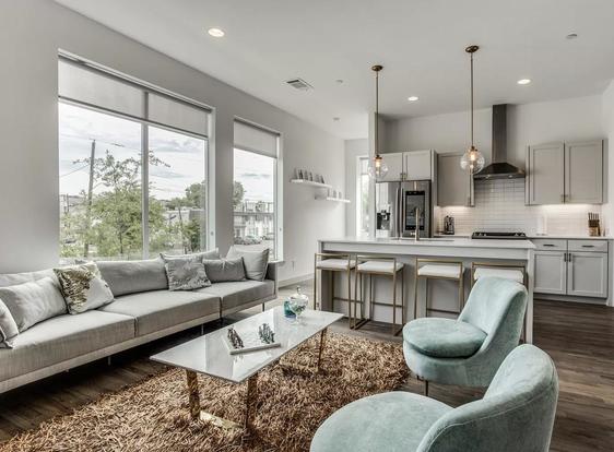 This newly built 2 bed, 2.5 bath Central Dallas townhome features updated and sleek living right in the city! Grey-stained oak hardwood flooring, an open-concept floor plan for easy entertaining, and lots of large windows highlight this great space. In the kitchen, youâll have stainless steel appliances, including a gas range and a dishwasher. There are also white quartz counters, a large island, and beautiful drop-down pendant lighting. This corner townhome also offers an in-unit washer/dryer, along with a balcony, a fenced front yard, and A/C! There is an attached two car garage as well as six community spaces available for this property.
