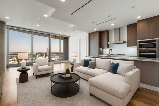 Luxury 26th-floor condo in the Bleu Ciel buildinb. 2 bedrooms, 2.5 baths, 1,527 sq ft, private 2-car garage, cover flows to the balcony with an outdoor fireplace. Gourmet kitchen, top-tier finishes, and premier amenities in Dallas’s Harwood District.