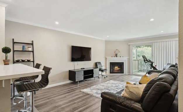 Top floor condominium flooded with natural light. This thoughtfully remodeled unit features architectural crown molding detail, designer lighting and engineered wood floors throughout. The open living room includes an electric fireplace with custom mantle and an outdoor space overlooking the lush green common area. The updated kitchen has a breakfast bar, quartz countertops, tile backsplash and stainless steel appliances. Completing this modernized home is a built-in wet bar, full bath with quartz counters, shower over tub and a spacious bedroom with ample closet space. Crown Colony complex has many amenities including 24-hour private gated security, pool, jacuzzi, gym, tennis & basketball courts, fitness center and billiard room. Easy freeway access, close to public transportation, shopping and local eateries. This unit includes 1-car garage parking and storage.