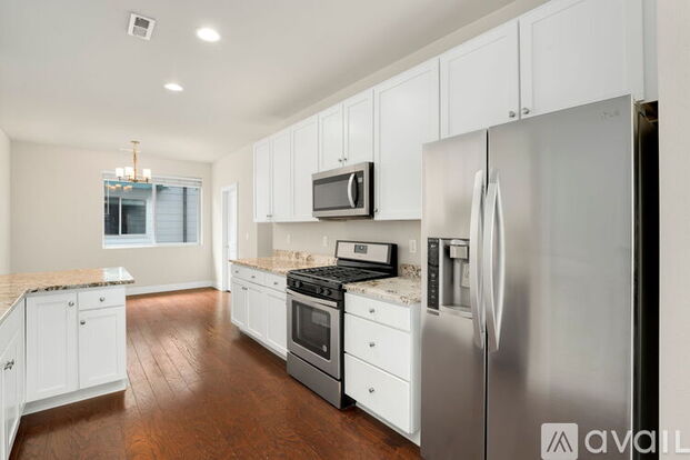 The main living level features a sunlit dining area and a gourmet kitchen with stainless steel appliances, a gas range, granite countertops, and extensive cabinet space- perfect for both casual meals and entertaining. The open-concept living room boasts oversized windows, a designated media wall with an elevated outlet for your flat-screen TV, and a convenient half bath for guests.