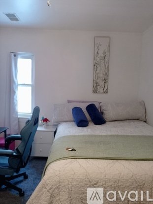Spacious, carpeted room with comfy queen-sized bed, desk, chair, dresser, closet, blackout curtains, and 50" smart tv. All utilities included. Common areas (stocked kitchen, dining room, living room, bathrooms, and laundry room) are shared with other guests.