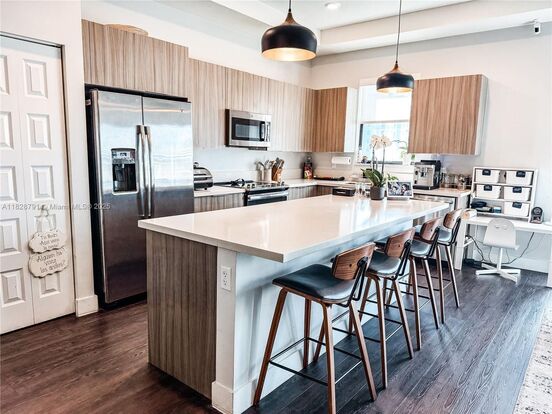 Discover luxury living in this beautiful 3-bedroom, 2-bathroom condo at Highland Parc, in Doral's prime area. Featuring Mohawk waterproof premium vinyl wood flooring throughout, the home offers a spacious walk-in closet in the primary bedroom and a custom closet in the children's room. The open-concept layout leads into a gourmet kitchen with GE stainless steel appliances, including a double-door refrigerator, stove, microwave, and dishwasher, plus white quartz countertops. A large 8ft kitchen island provides extra storage. Impact windows and doors with blackout shades ensure privacy. Relax on the balcony with unobstructed sunset views. The clubhouse offers resort-style amenities. Minutes from top schools, shopping, and dining, this condo is a must-see!