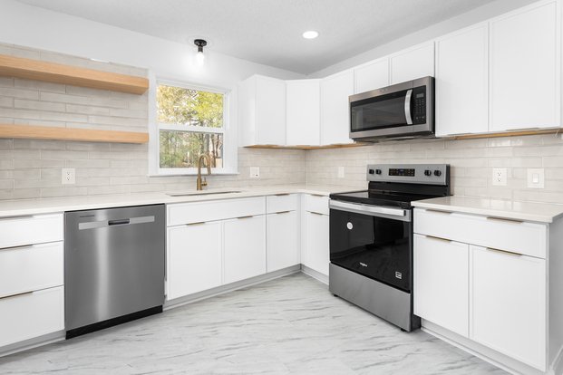 This beautifully renovated 2-bedroom, 1-bathroom home in the heart of Durham features numerous modern updates, including new windows, siding, roof, gutters, and exterior doors. Inside, you'll find contemporary soft-close cabinets with sleek under-cabinet lighting, fresh paint throughout, stylish gold and black hardware, and updated light fixtures in every room. The kitchen shines with new Whirlpool stainless steel appliances and elegant quartz countertops. The bathroom includes tile flooring and a brand-new shower, and the home boasts refinished hardwood floors as well as new vinyl plank flooring for a fresh, cohesive look. Located less than 10 minutes from Downtown Durham, Duke University, and Research Triangle Park, this home offers both comfort and convenience.