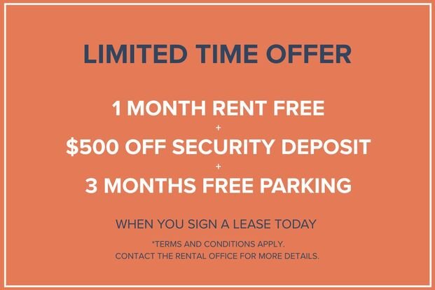 1 Month Rent Free + $500 Off Security Deposit + 3 Months Free Parking