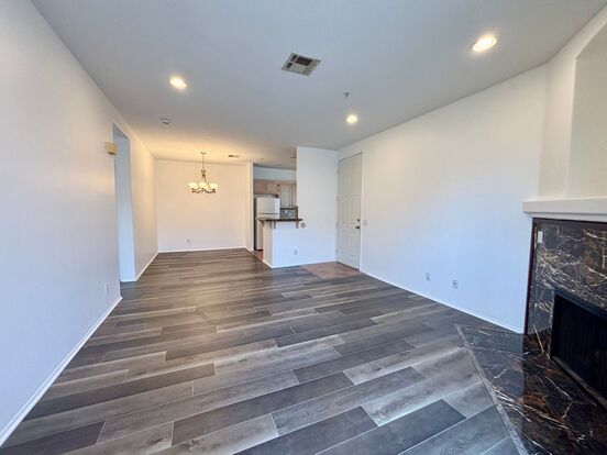 Beautiful 3 bedroom 2 bath condo with large balcony and cozy fireplace in living room. Features open floor plan, upgraded flooring, new paint, kitchen with granite counter tops, large bedrooms with plenty of closet space, laundry hookups in hall closet and central heat and air conditioning. Easy freeway access. Includes the following amenities: pool, spa, exercise room and playground.