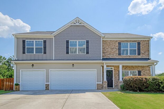 This 5 Bedroom, 3522 Square Feet home has a Guest Bedroom with private bath on the main level with Dining Room/Living Room combination and a Family Room with Gas Fireplace. Open floor plan with eat in kitchen, island, granite countertops and stainless appliances and tiled backsplash. Gas Cooktop. Upstairs is a HUGE main bedroom with private ensuite with garden tub and shower. An additional bedroom has its own private bath. Two additional bedrooms share a hall bathroom. Yes that is 4.5 Bathrooms. And the media room is also on this level perfect for pool table or other gathering space. There is a three-car garage with plenty of room for your cars and golf cart, if that is your preference. Covered front and back porches. Fire pit. Neighborhood has a playground and community pool. 10 minutes to everything in Evans like the movie theater, Evans Town Center Park, Columbia County Performing Arts Center etc. 20 minutes to Fort Eisenhower or downtown Augusta. Dog friendly with owner approval and non-refundable pet fee. Questions? please contact Debbie at (706)495-7181.