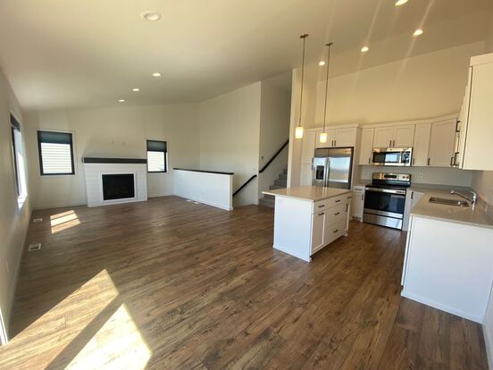 Welcome to our spacious 3 bed, 3 bath townhome in a desirable neighborhood! The main level features tall ceilings and an open concept living room, dining, and kitchen, perfect for entertaining guests or spending quality time with loved ones. The living area is complete with a cozy gas fireplace, perfect for chilly winter nights and/or ambience throughout the year. This property features beautiful black windows throughout. These are highlighted in the main living area, which face west, allowing plenty of natural light and a view of a pond from your backyard.