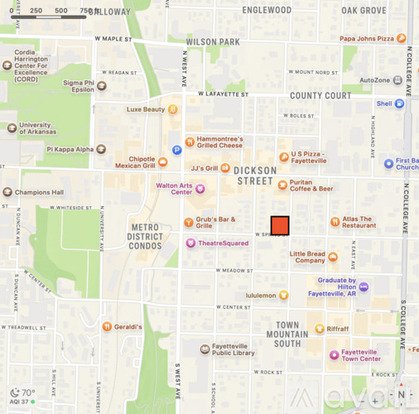 1 bedroom, 1 bathroom apartment in downtown Fayetteville, with all utilities included! One block from Dickson Street. Two blocks from the Walton Arts Center and Theatre Squared. Walk to the University of Arkansas, the Square, Wilson Park, the Fayetteville Public Library, and more. Laundry in building. Utilities included: electricity, gas, water. Cats and small dogs allowed with pet deposit and rent.