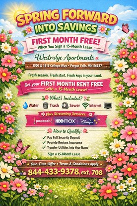 1st MONTH FREE WITH A SIGNED 12-MONTH LEASE! - Welcome to our secure access building in Fergus Falls, MN, where you can enjoy peace of mind with security cameras and on-site management. Our 1-bedroom, 1-bathroom apartments offer convenience with on-site laundry and parking options, including the availability of a garage. Take advantage of our special offer - receive your first month free with a signed 12-month lease! Plus, rest easy knowing you are in a smoke-free building. Contact us today to schedule a tour and make this your new home sweet home.