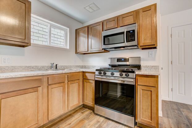 Luxury vinyl tile throughout all rooms and brand new appliances, including refrigerator, stove, and microwave.