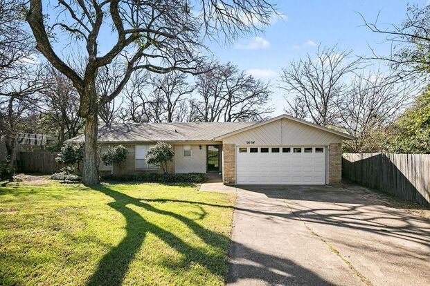 Welcome home to this spacious and updated single-story home in Fort Worth. This 3 bedroom, 2 bathroom property features a large living area with vaulted ceilings, a beautiful brick fireplace, and plenty of natural light. The kitchen offers granite countertops, ample cabinet space, and stainless steel appliances including a refrigerator, dishwasher, range, and built-in microwave. Enjoy easy-care flooring throughout and comfortable bedrooms with ceiling fans. The primary bathroom includes an oversized vanity with granite countertop and updated fixtures. Additional highlights include a dedicated laundry area with hookups, a 2-car garage, and a large backyard with mature trees. Relax or entertain on the covered back deck overlooking the spacious yard. Convenient location with quick access to major roads, shopping, and dining.