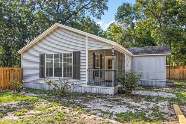 Situated on a large, mostly fenced-in lot, the property backs up to the woods, providing a beautiful and private setting. Indulge in outdoor relaxation on the front and back porches and take advantage of the large shed for additional storage. Outdoor lovers will appreciate the proximity to Choctaw Beach Park, where you can launch a boat, fish, or let the kids play on the play scape. Private and serene, this home is the ideal retreat for those seeking a quiet and convenient lifestyle. Water/sewer & trash included with rent. Schedule your showing today!