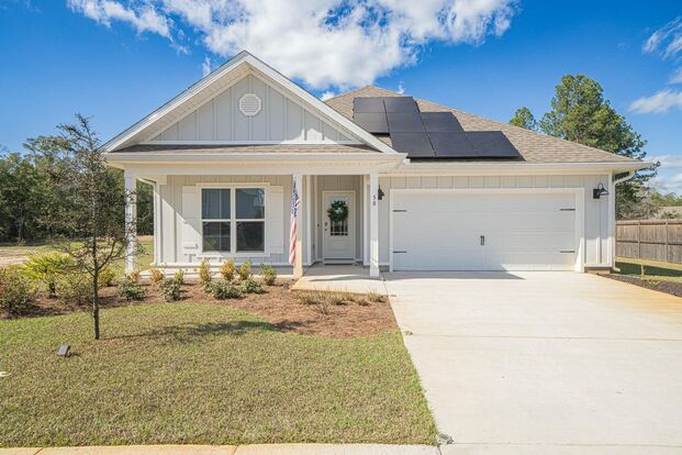 Welcome to this stunning 4-bedroom, 2-bathroom home offering 1,752 square feet of thoughtfully designed living space on a spacious quarter-acre lot in a peaceful, community-centered setting. Built in 2023, this residence blends timeless comfort with modern efficiency, highlighted by original stainless steel appliances, solar panels that offer significantly reduced electric bills, and an ADT security system already in place for use. Upon entry, you're greeted by a bright and welcoming foyer that leads to three well-appointed guest bedrooms and a full guest bath situated at the front of the home—ideal for guests or a home office setup.