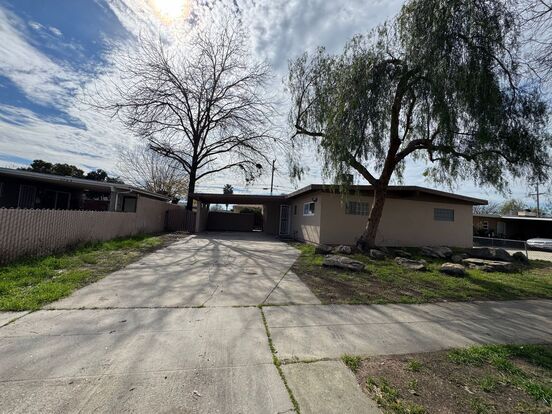 This house has approximately 1160 square feet with a living room, bonus/family room, dining area, NEW carpets in bedrooms, tile flooring in kitchen and bathroom, laminate flooring, blinds, granite counters, gas range, garbage disposal, laundry hook-ups, central heat & air, 2-car covered carport, landscaped front yard & huge backyard, covered back patio. Take E. Dakota Ave to N. Mariposa Street, then turn left onto E. Saginaw Way. Close to school, park & shopping. Pets very strictly negotiable (1 small pet under 20lbs, outside only). L/D!